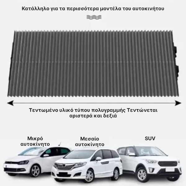 Αυτή η αντηλιακή προστασία είναι σχεδιασμένη να ταιριάζει σε μια ευρεία γκάμα οχημάτων, συμπεριλαμβανομένων αυτοκινήτων, βαν, φορτηγών και SUV. Προσφέρει καθολική εφαρμογή, καθώς μπορείτε απλά να κόψετε το πλάτος στη ζητούμενη διάσταση.